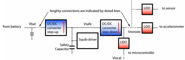 以下简单介绍气袋系统的充气过程。气袋系统设有升压转换器。一般来说,这些升压转换器都采用 sepic 或回扫配置。进行充气之前,气袋系统的升压转换器会先将电池电压 (Vbat) 提高 (这个电池电压在负载倾卸时可高达 40 伏),直至达到安全电压 (Vsafe) 要求的水平,这样可确保安全电容器储存大量电能。之后,才将这个较高的安全电压调低至几伏,这个较低的电压称为远程电压 (Vremote)。这个充气准备程序必须严格依从,以确保其后几级的低压降稳压器出现较少压降。压降幅度越少,功率耗散也就越少,效率也就越高。